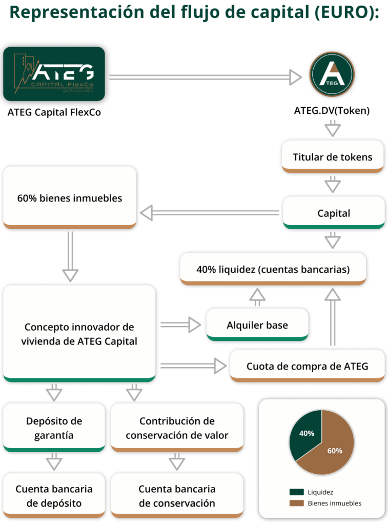 - Nuestro innovador concepto de vivienda se basa en un flujo de capital bien pensado, que permite estabilidad y crecimiento. Los interesados en el token invierten capital a través del token ATEG.DV, lo que genera liquidez y se dirige específicamente a inmuebles y estructuras operativas.