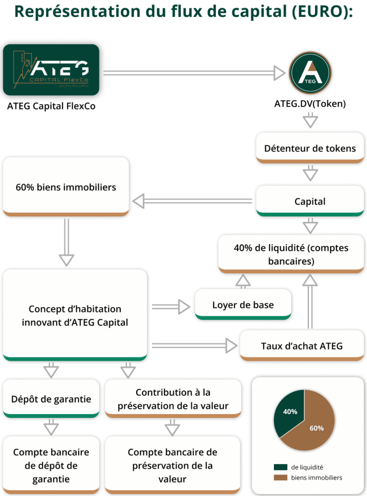 - Notre concept d’habitat innovant repose sur un flux de capital réfléchi, garantissant stabilité et croissance. Les personnes intéressées par les tokens investissent du capital via le ATEG.DV Token, ce qui génère de la liquidité et permet de l’orienter spécifiquement vers l’immobilier et les structures opérationnelles.